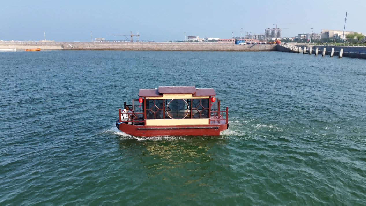 本船船身采用海洋级镁铝合金制造,既传承经典画舫的国风造型底蕴,又兼具现代船艇的结构耐用性与轻量化优势,全船视野开阔无遮挡,完美适配游客观景、拍照的核心需求。船体总长 6.00m、型宽 2.30m、型深 0.70m,空间规划科学合理,合规核载 9 人,可充分满足景区观光载客、家庭休闲游湖、亲友小聚泛舟等多元出行需求。