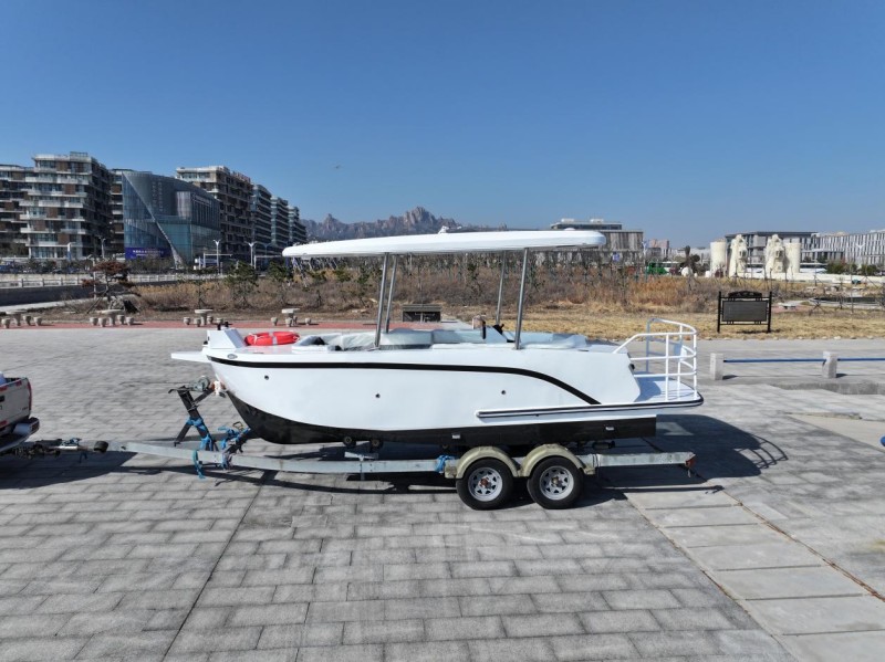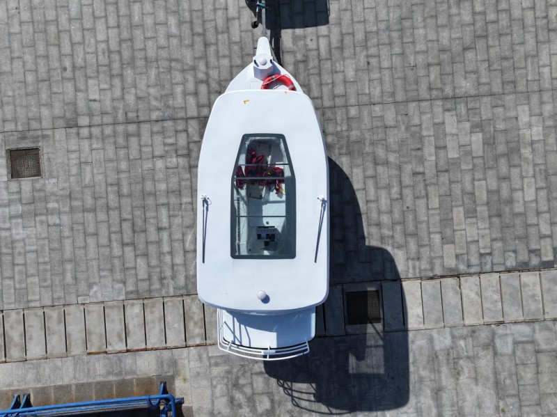 本船船体采用海洋级镁铝合金制造,整体线条流畅、造型现代简约。 顶棚采用玻璃钢材料建造,顶棚中间嵌入烟灰色亚克力玻璃, 全船配有大量LED氛围灯和水下氛围灯,夜间航行更加舒适,提升氛围感。 本船配备2台吊舱电动机和智能驾驶系统,游客可在人工驾驶和智能驾驶双模式间自由切换,体验科技之美、航行更有乐趣,同时也确保航行和停泊安全。